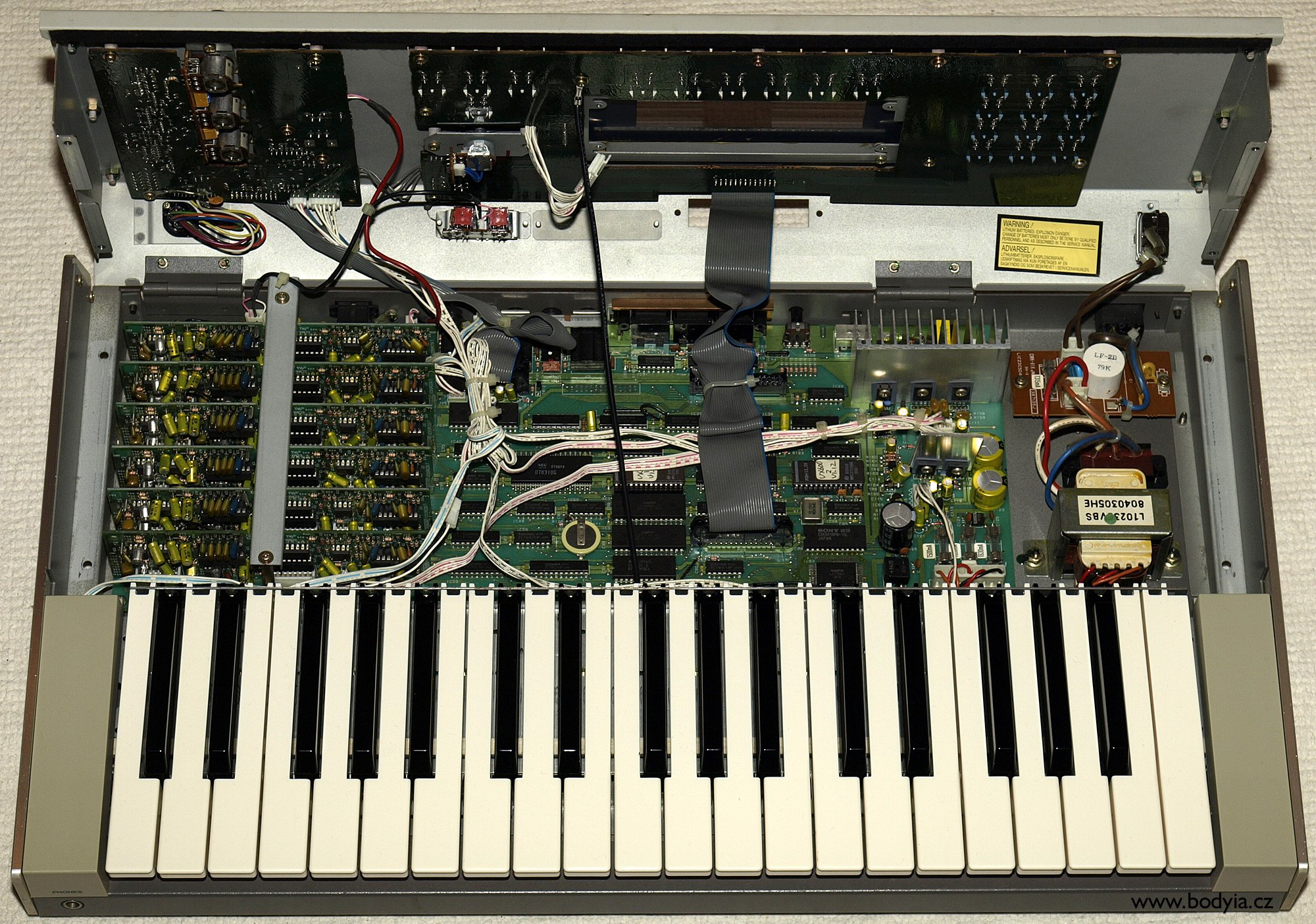 Uvnitř je rozměrná základní deska, na které jsou v šesti slotech voice boardy. Známým neduhem je pískání invertoru pro displej, jeho pokus o výměnu však skončil neúspěchem - pískání sice zdánlivě zmizelo, ale po připojení audio kabelu se ukázalo kam - do výstupu. 'Vyřešil' jsem to přepínačem viz zde a displej osvětluji LED páskem externě.